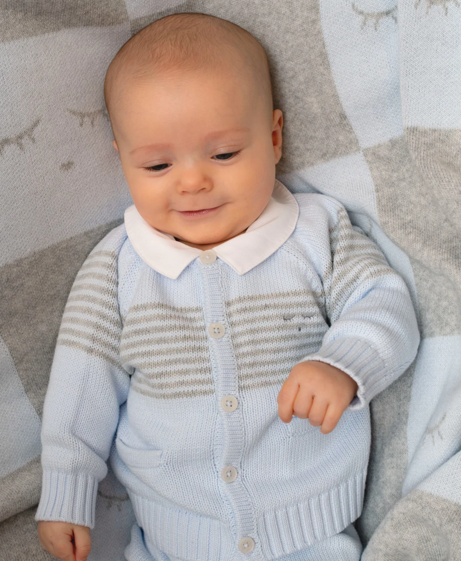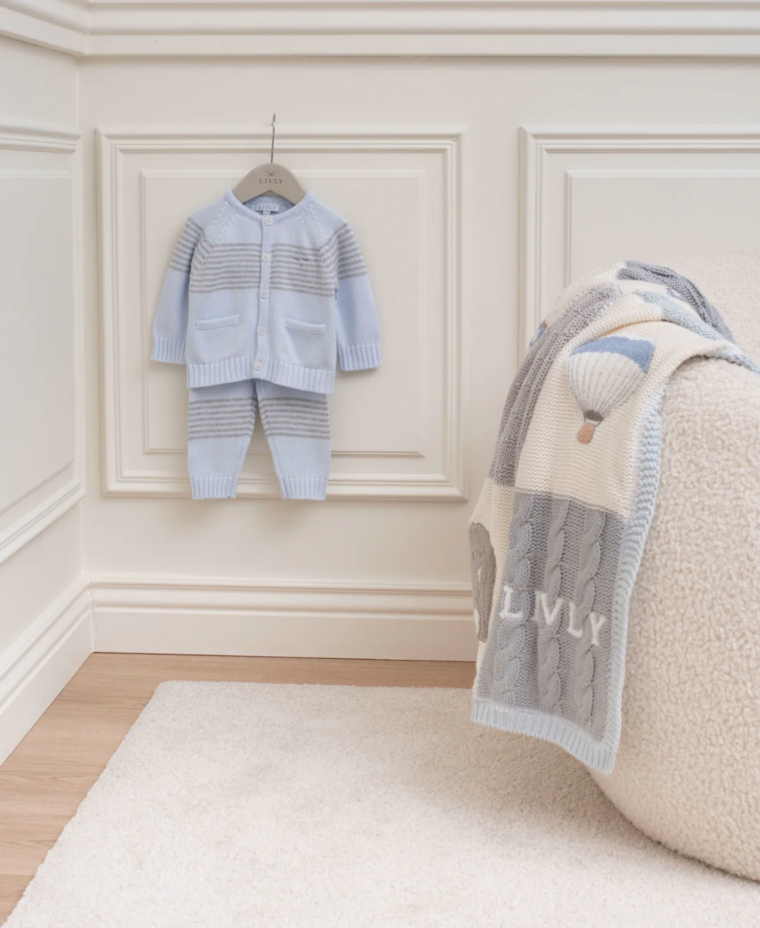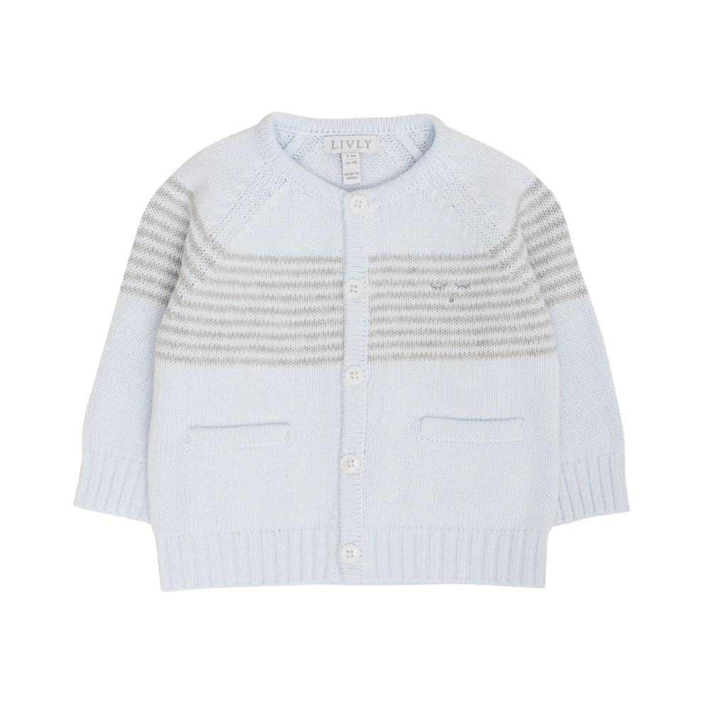 Dásamlega falleg, ljós blá prjónapeysa frá sænska merkinu Livly. Peysan er hneppt, með litlum vösum og útsaumuðu logo að framan. 100% bómull.