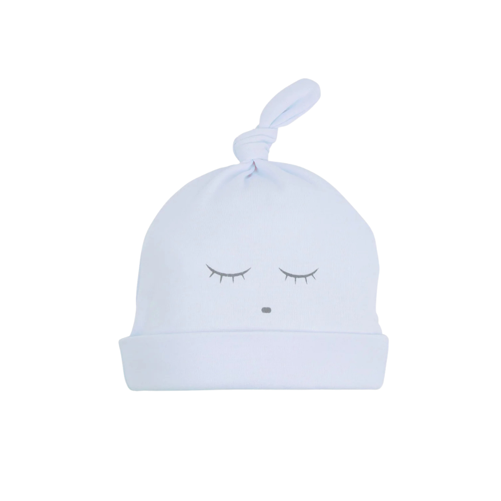 Ljós blá húfa úr mjúkri bómull frá sænska merkinu Livly. Húfuna er hægt að minnka og stækka með því að stilla hnútinn eftir því sem hentar. 100% pima bómull.