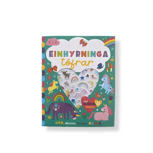 Skemmtileg og töfrandi einhyrningabók sem er full af þrautum, síðum til að lita og límmiðum sem hægt er að skreyta með