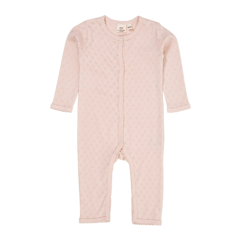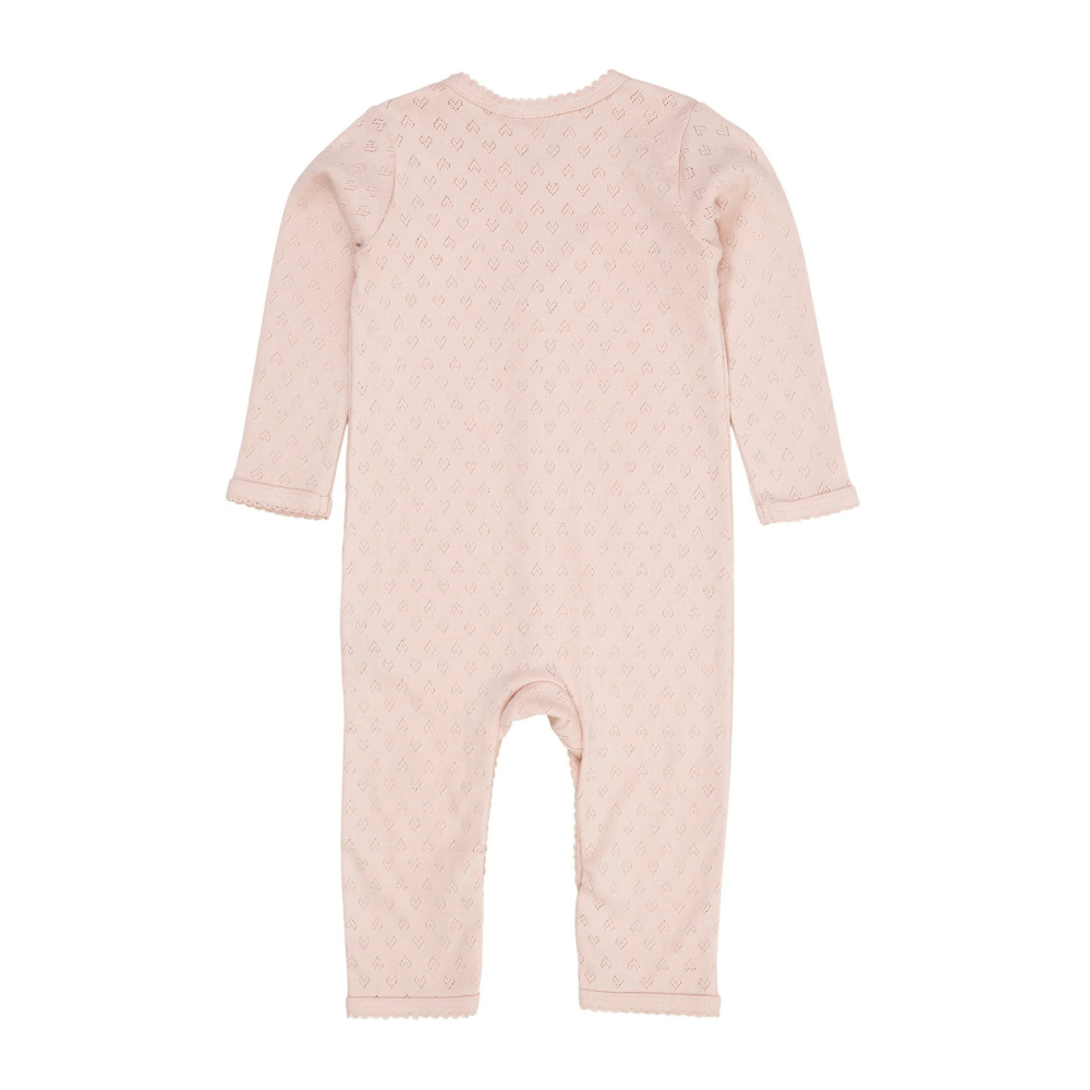Ljós bleikur heilgalli með smáu gatamynstri frá Copenhagen Colors. Gallinn er smelltur að framan. 100% bómull.