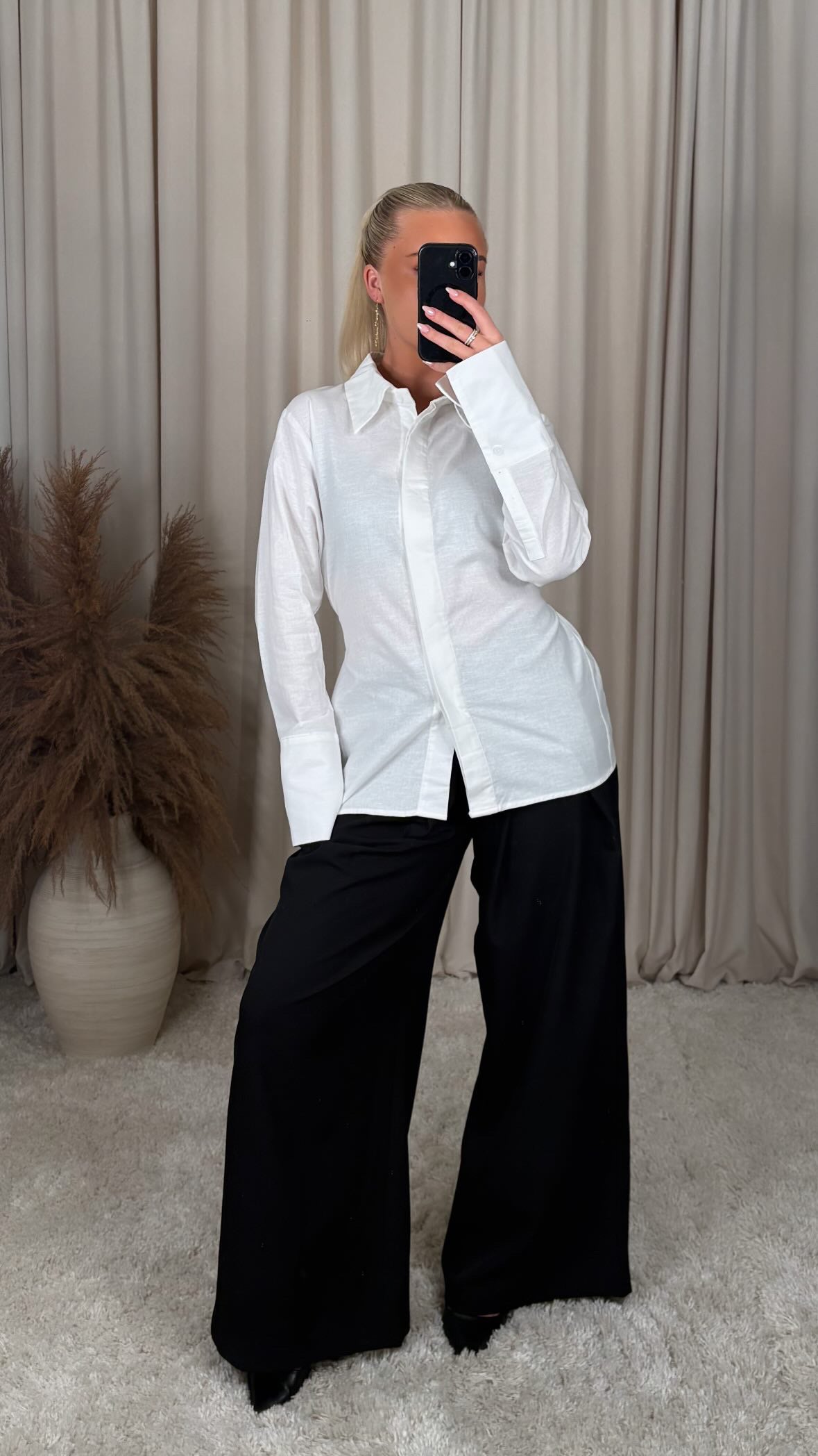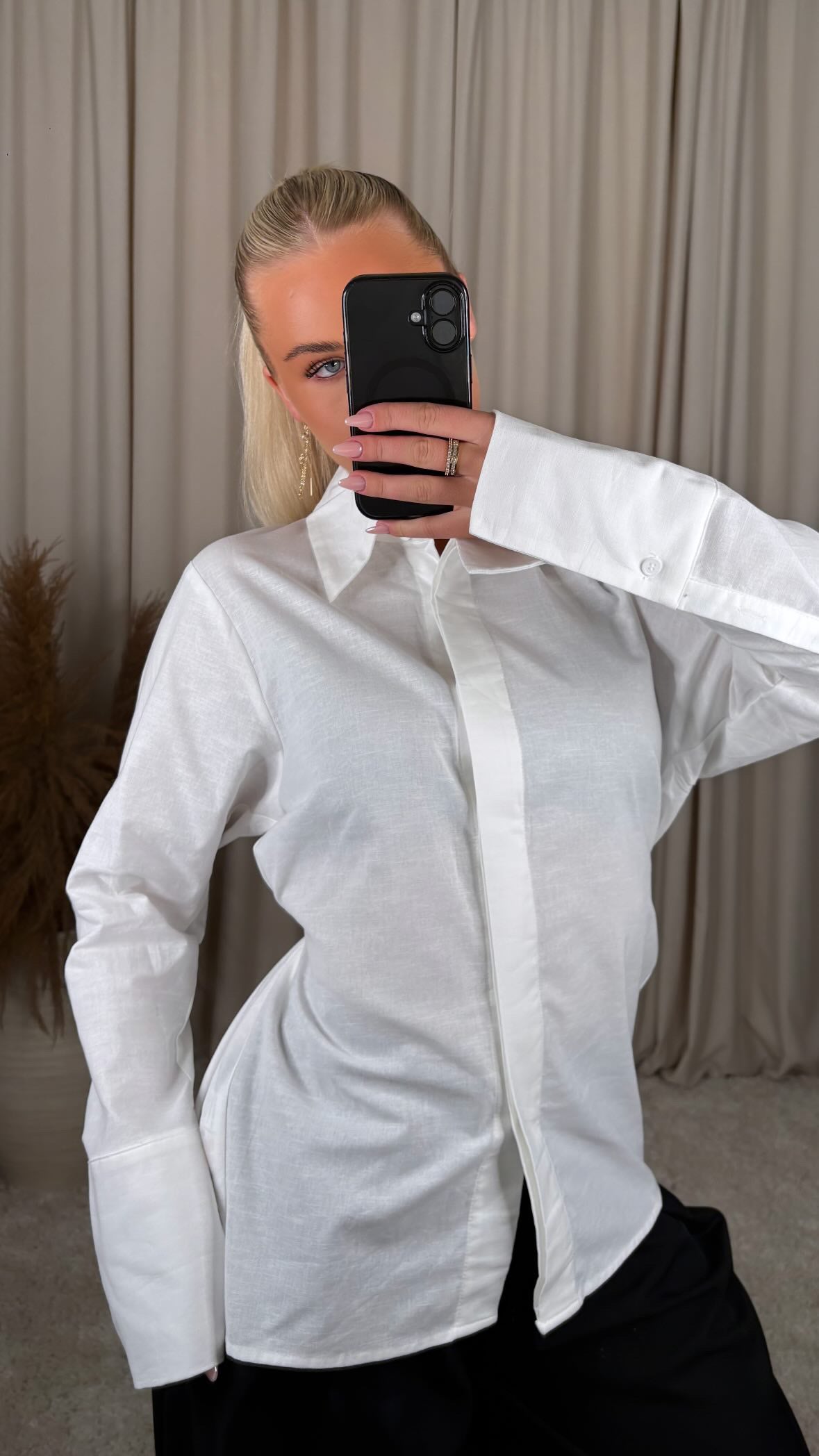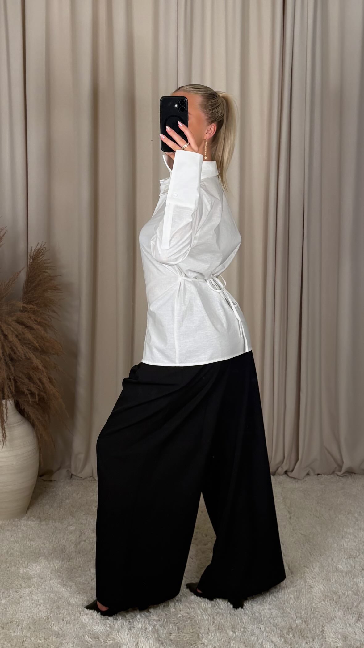 Linen Cinched Waist Skyrta Falleg og tímalaus skyrta með aðsniðnu mitti sem mótar líkamann og skapar kvenlegt og elegant snið. Skyrtan er bundin að aftan , sem gerir þér kleift að stilla ... Sjá nánar