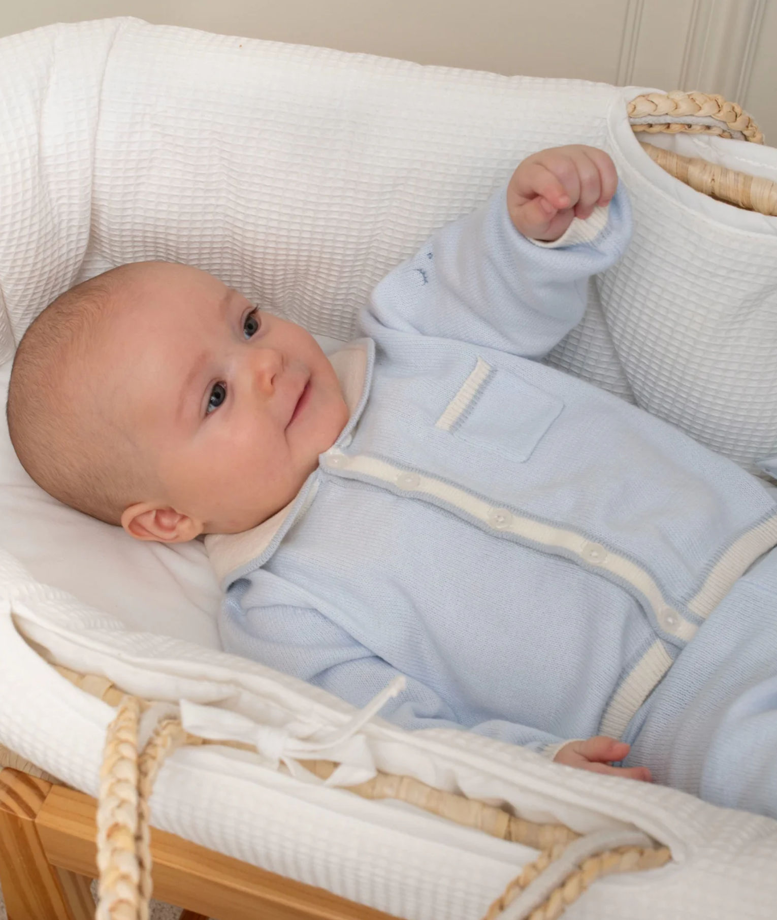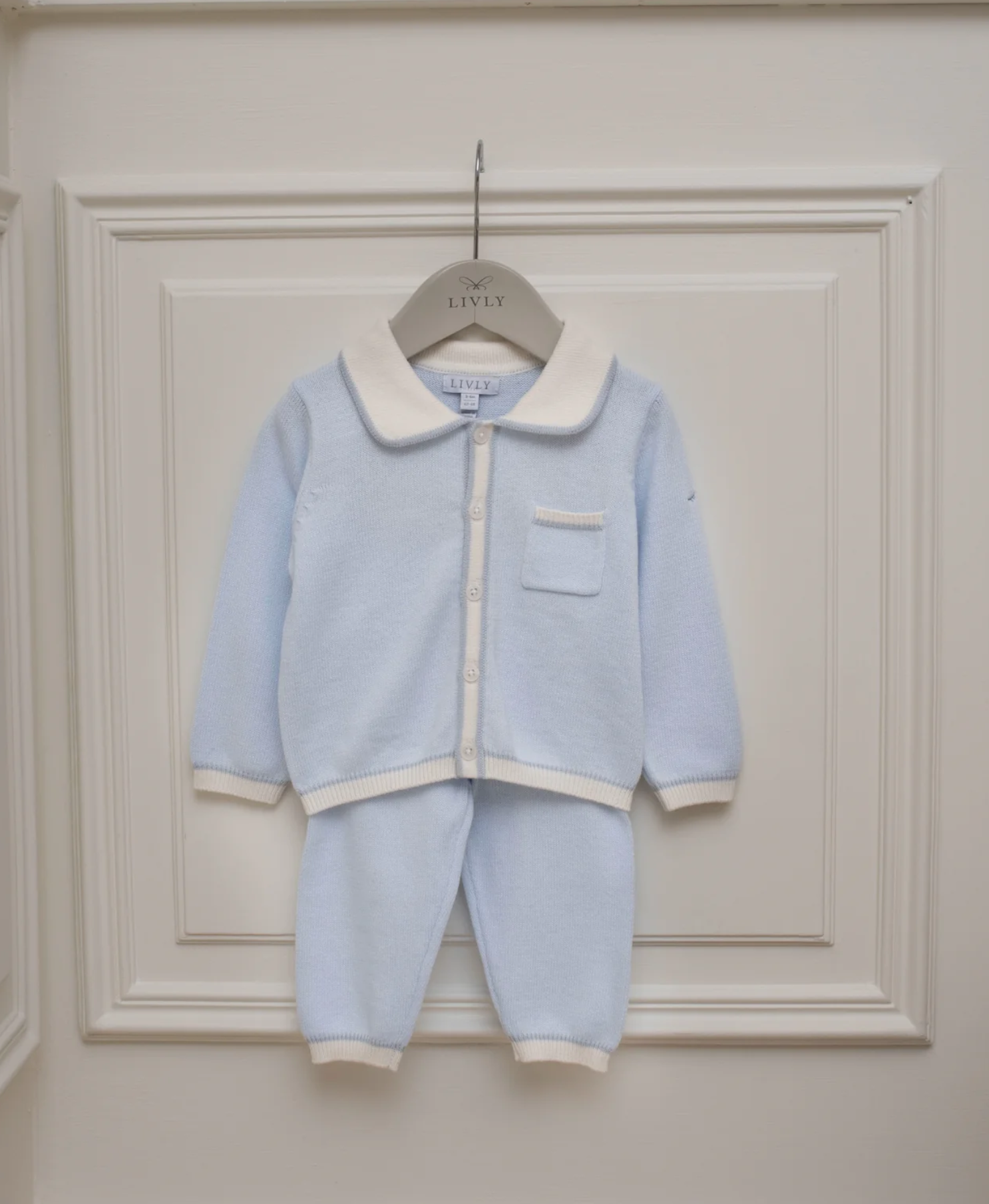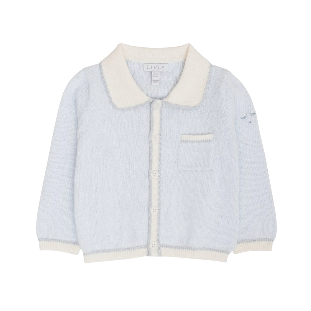 Ljós blá, hneppt prjónapeysa með kraga og litlum brjóstvasa frá sænska merkinu Livly. 100% bómull.