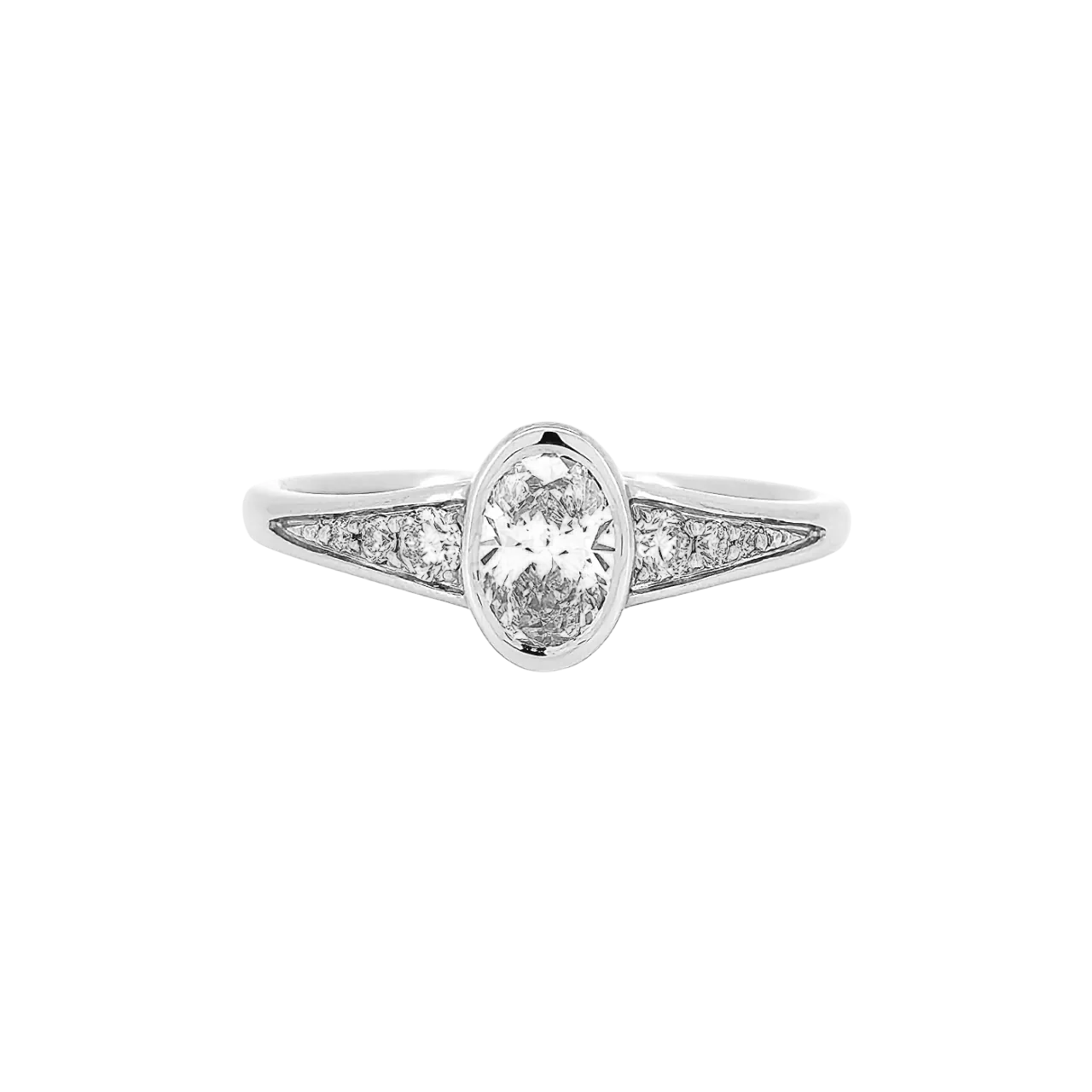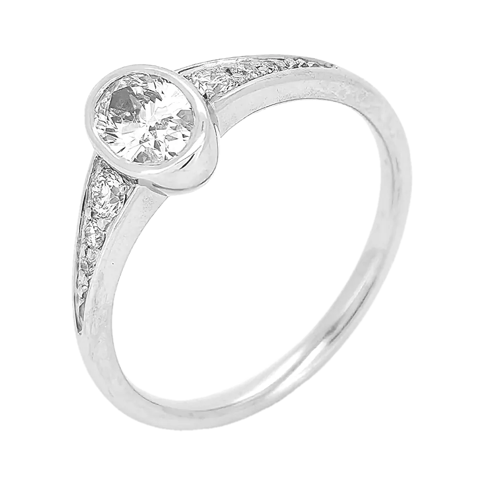 Efni hrings: 14kt hvítagull Steinar: 7 ræktaðir demantar – 0,68ct – River VS1 – miðjudemantur er 0,54ct oval
